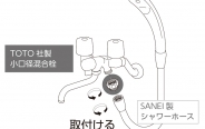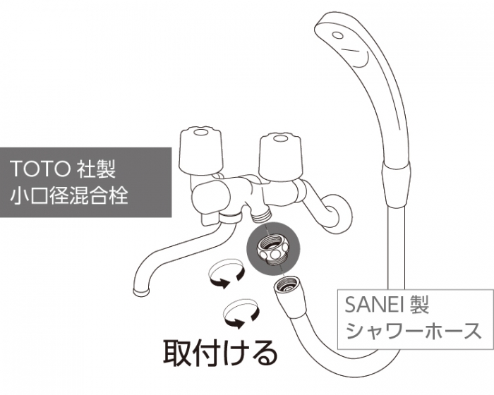 TOTO社製小口径混合栓にSANEI製のシャワーホースを接続